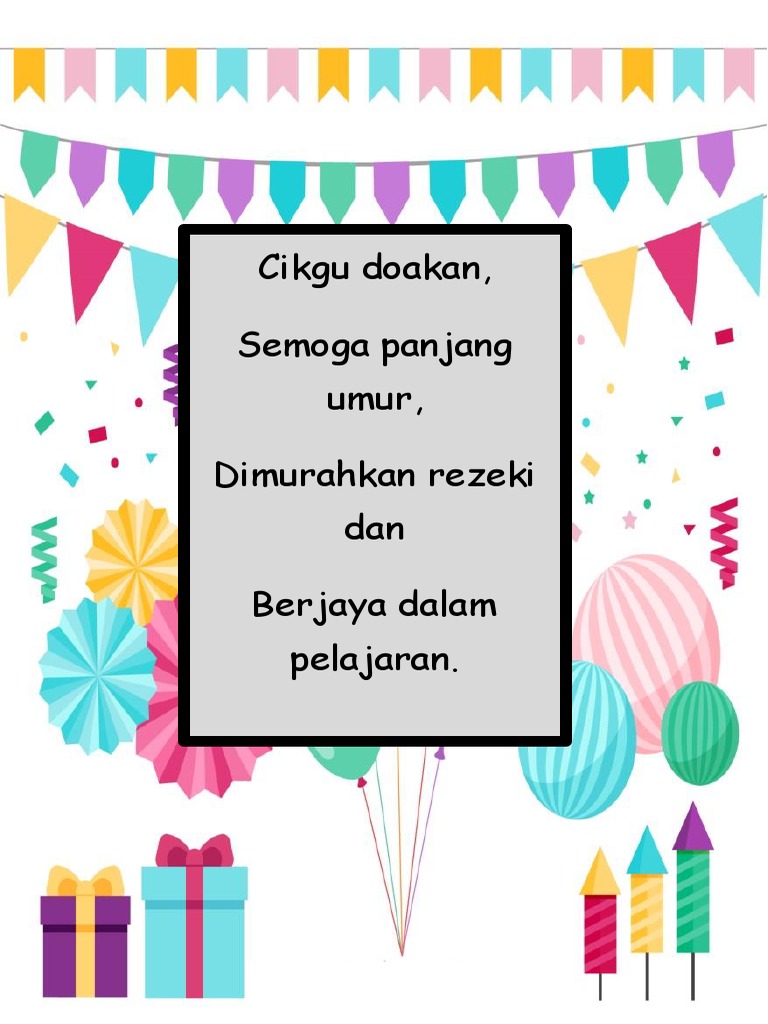 Hiasan hari jadi kanak desainrumahid. Kad shaker mempunyai panel yang jelas di bahagian depan dan dipenuhi dengan bahan yang bergerak ketika digoncang. Doa untuk hari jadi/ wish birthday sweet/ucapan selamat hari jadi semoga dikurniakan iman yang sempurna, akhlak yang terpuji, pekerti yang mulia, umur yang bermanafaat, rezeki yang halal, ilmu yang berguna, jodoh yang membahagiakan, hidup yang dirahmati di dunia dan akhirat. Sekiranya anda terpaksa mengetuai bash ulang tahun terakhir, anda boleh menjangkau laci dan merebut salah satu kad ini di mana sahaja. Terima kasih kerana melayani ibu dan ayah dengan baik sekali. Untung yang masih ada bapa, masih boleh berbakti pada orang tua. Semoga anda mempunyai hari jadi yang indah. Kad jemputan hari lahir bayi pertama sepatutnya bila peribadi khas untuk bayi anda. 2 march at 19:22 · like kak jie jie terkekeh2 akak sorang bila baca balas pantun ni.saja cari nk copy masuk blog.terima kasih kepada semua rakan yg cukup spoting.cayok3. Berikan kepada kawan dan nikmati. Tapi di kafe mia, anda boleh dapatkan kek hari jadi dengan harga serendah rm50. Arahan pembuatan kad hari jadi dengan belon; Semoga allah melindungi setiap langkahmu, diberikan kesihatan yang baik, dipanjangkan usia, dimurahkan rezeki, diberikan kebahagiaan dunia dan akhirat, menjadi anak yang solehah serta menjadi yang terbaik untuk diri.
